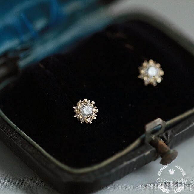 1粒大きめのCZダイヤの周りに小さいCZダイヤが並んでいます。光に当たるとキラキラして、存在感があるピアスです。