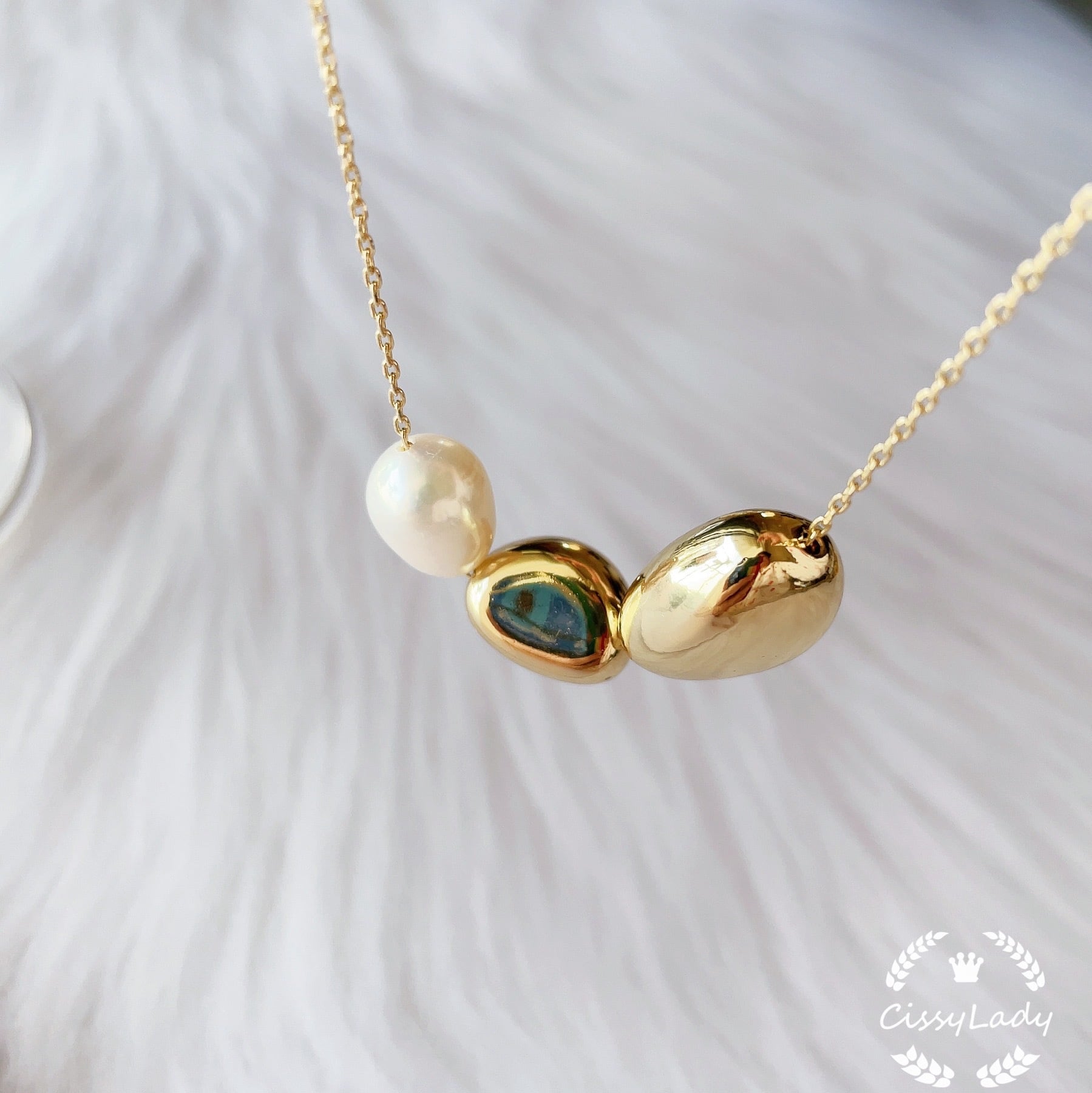 2つ大きめの不規則の金属ビーンズと1つバロック淡水パールで作ったシンプルなネックレスです。