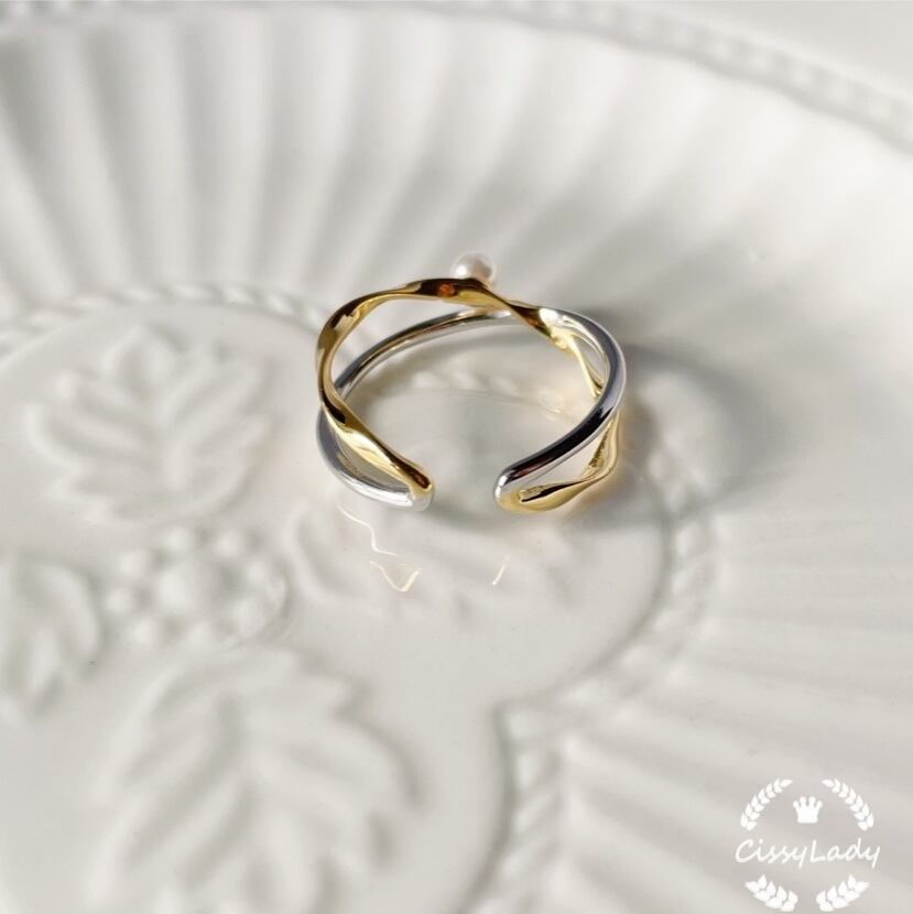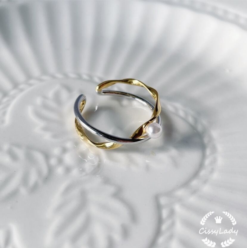 Sv925純銀製 シルバーとゴールドコンビ ねじり クロス パール 指輪 サイズフリー K18仕上げ silver925