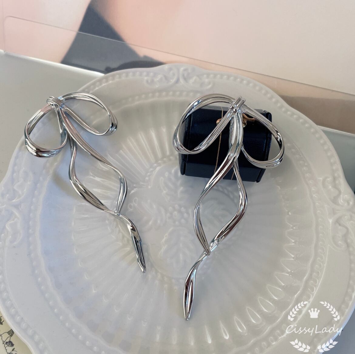 新作 大ぶり シルバー 風に舞ったリボン ピアス かわいい