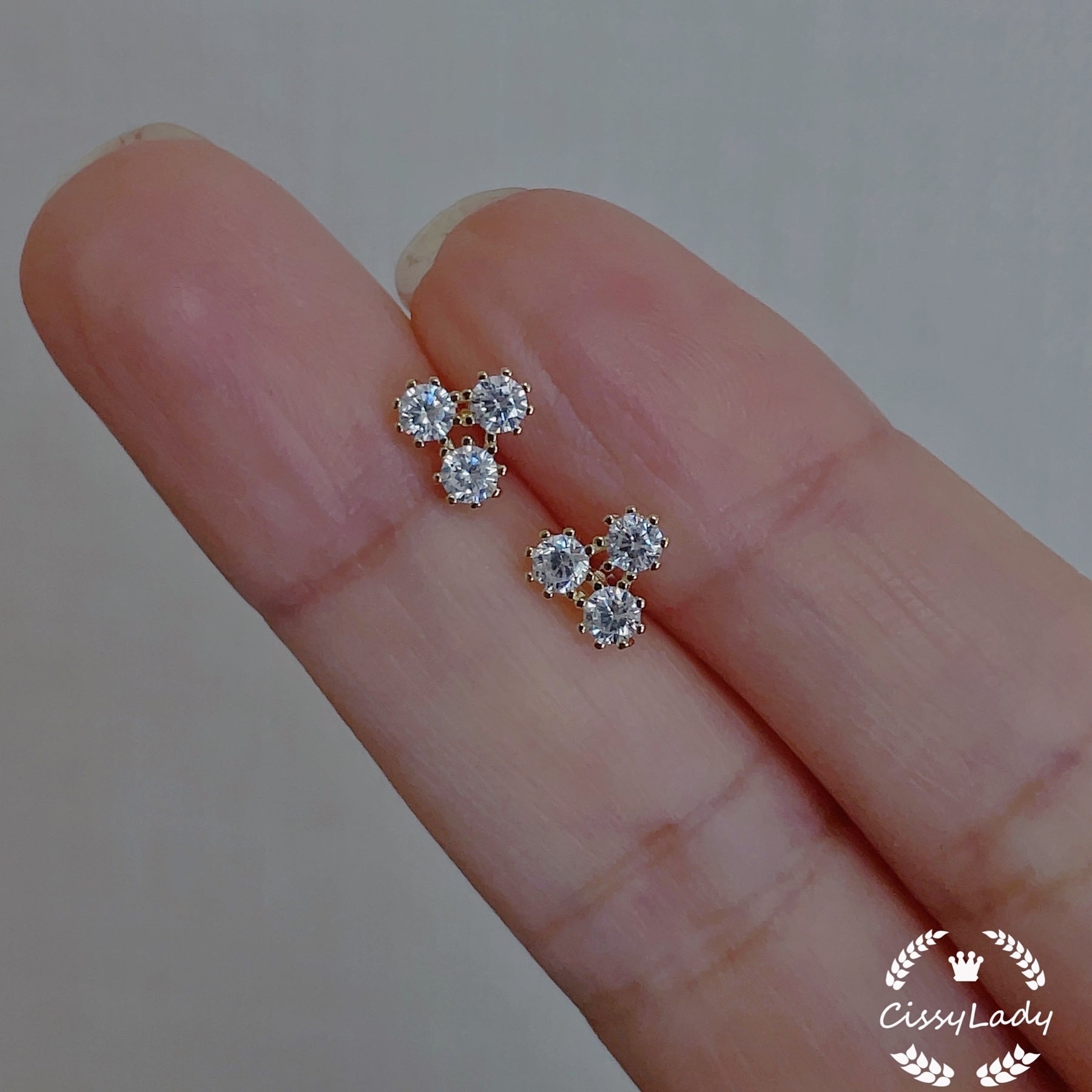 Sv925純銀製 三つのストーン CZダイヤ 三角 シンプル ミニピアス K14仕上げ