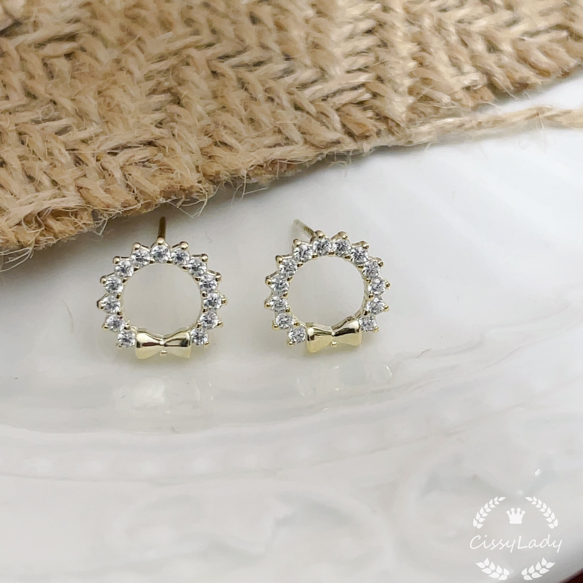 Sv925純銀製 リースとリボン CZダイヤ ミニピアス K14仕上げ silver925 高品質