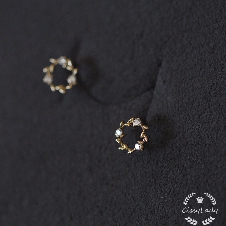 Sv925純銀製 CZダイヤとリーフのリース ミニピアス K14仕上げ silver925 高品質 E8148