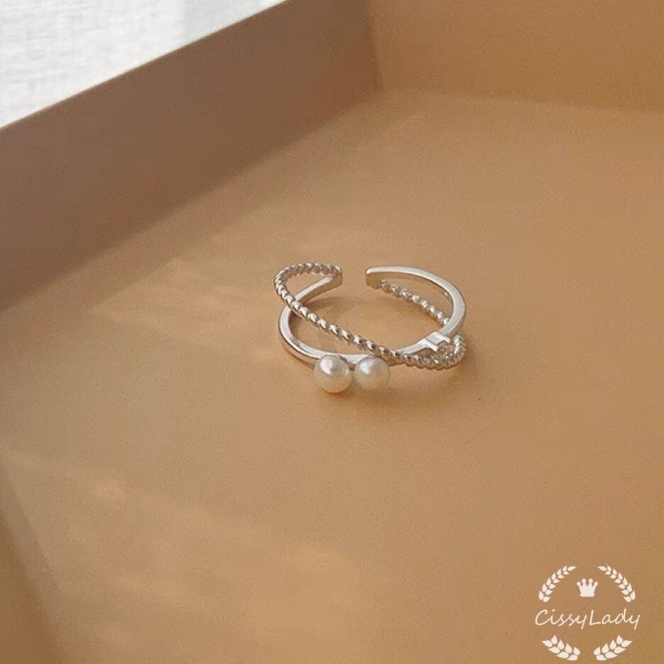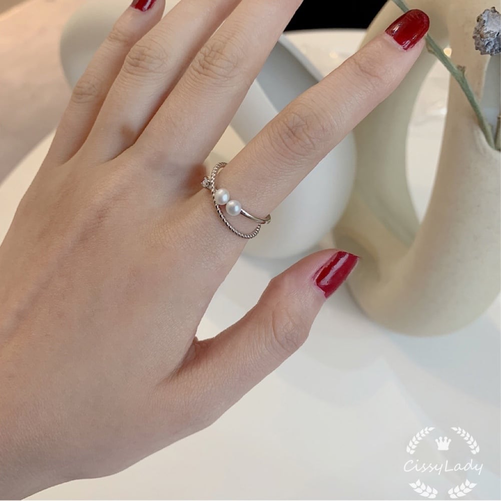 Sv925純銀製 繊細 2粒の淡水パール クロス リング ピンキーリング 指輪 リング プラチナ仕上げ