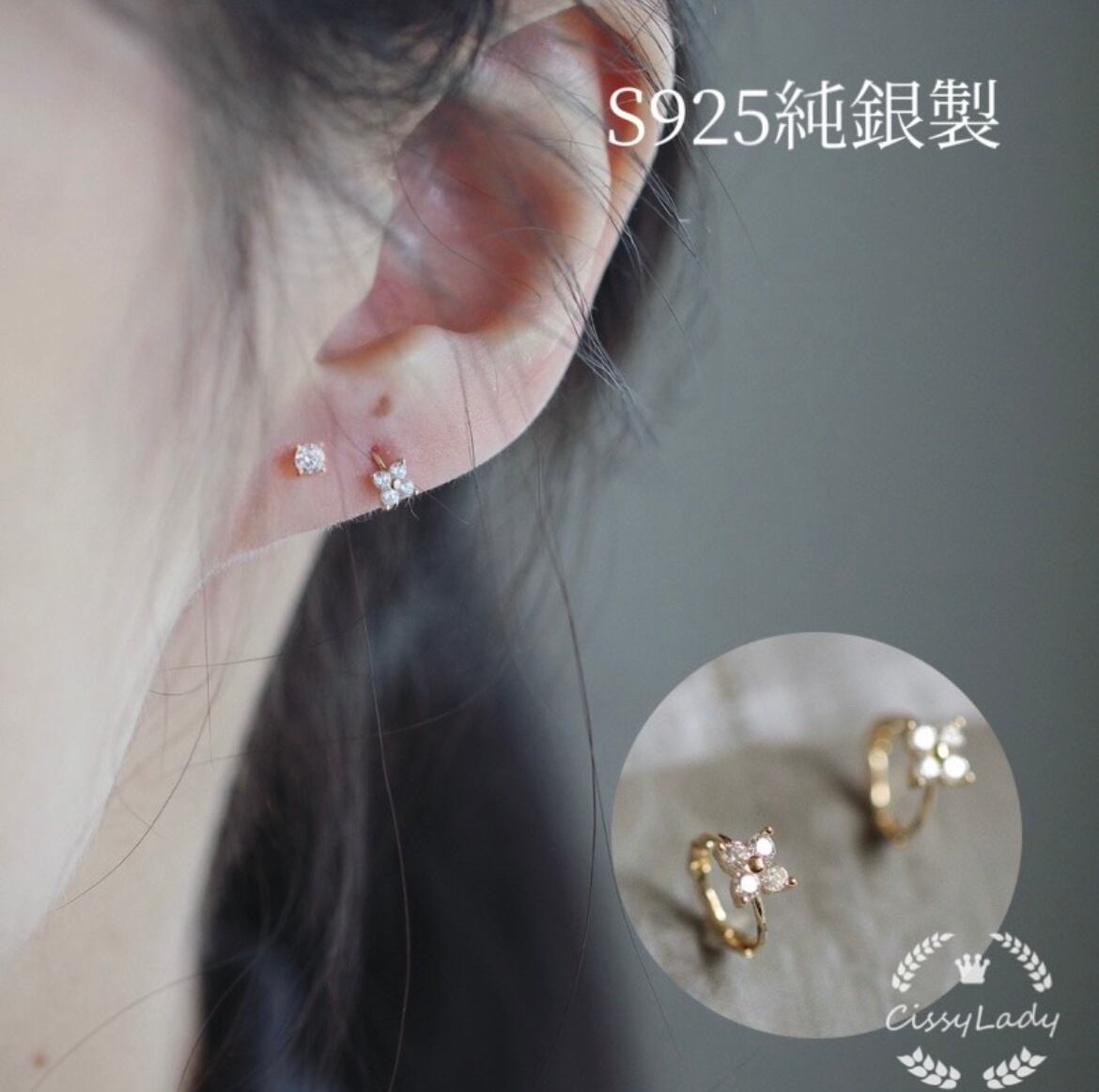 Sv925純銀製 18kgp 繊細 クローバー ミニ フープ ピアス