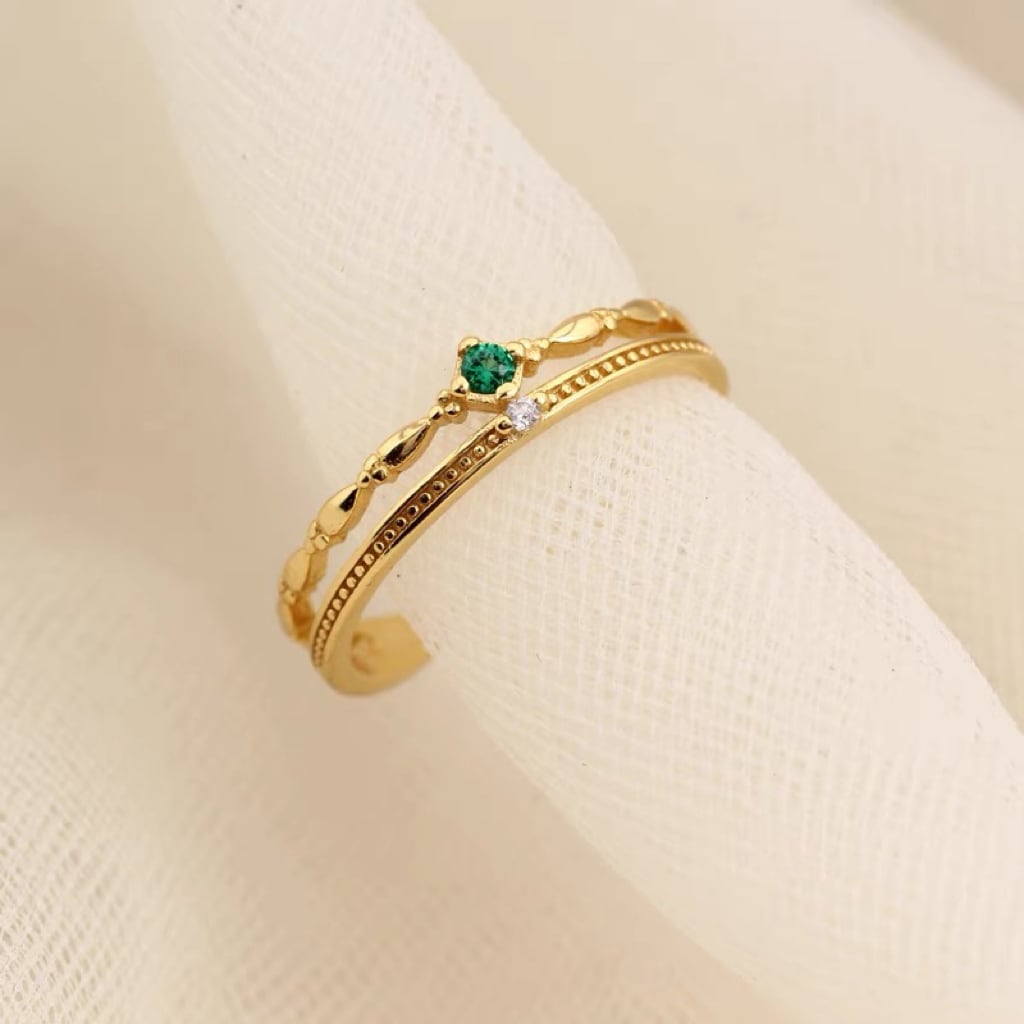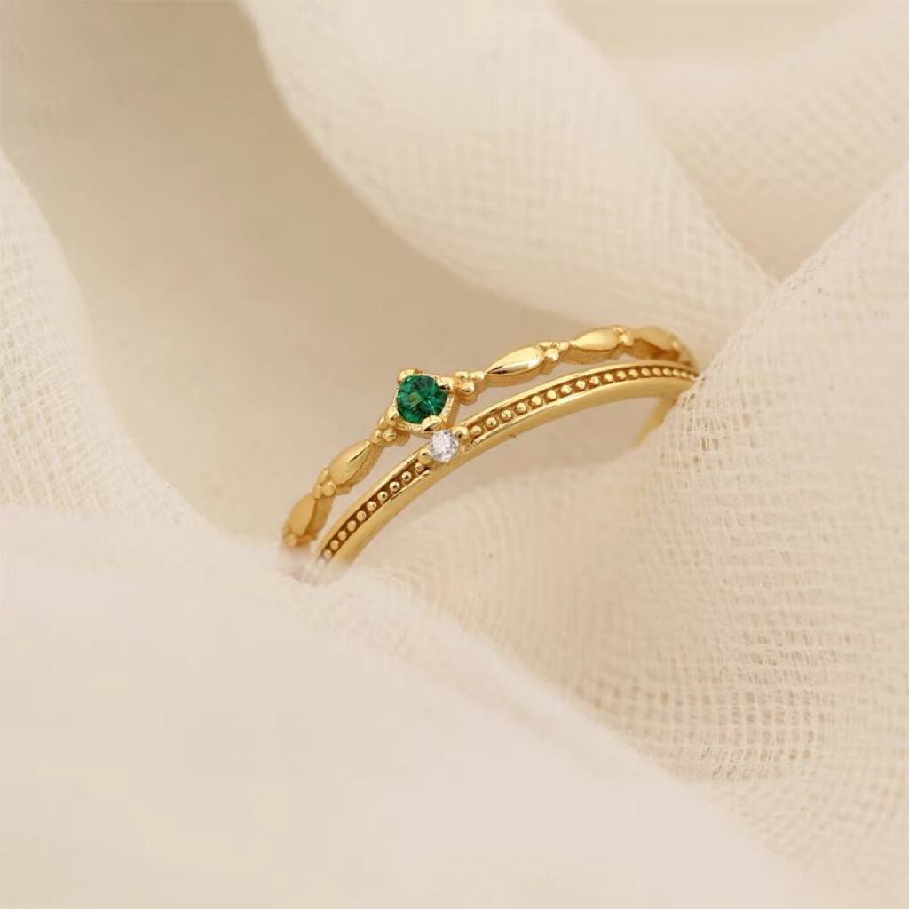 Sv925純銀製 2層 エメラルドカラー ストーン リング 指輪 リング K18仕上げ フリーサイズ 金属アレルギー対応 つけっぱなし